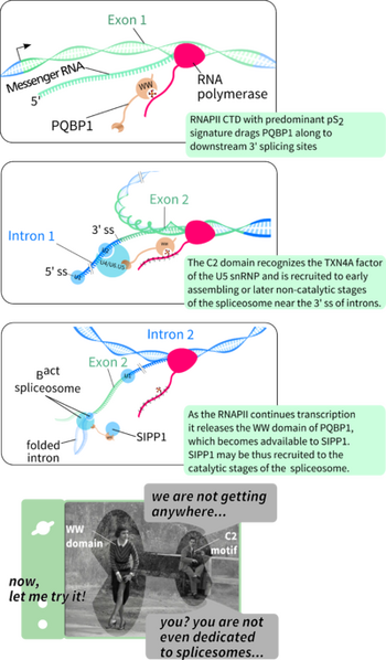 The diverse lesions in PQBP1 may lead to similar intelectual and morphological symptomes. Besides the Y65C point-mutation, all other X-LID associated PQBP1 mutation produce truncated proteins, which lack a C-terminal intrinsically unstructured domain known to bind the spliceosome assembling factor U5-15kDa. Such facts suggest that the WW domain of PQBP1 is sufficient to cause X-LID but not exclusively necessary as causative agent. It is posible that PQBP1 is firstly recruited by elongating RNAPII, then co-localizes to the assembling spliceosome through its C-terminal domain and, driven either by affinity or effective specificity, dynamic WW-mediated recognition may switch to SIPP1 binding to help activate the catalytic steps of pre-mRNA splicing. Alternatively, the role of RNAPII recognition may be secondary to the recognition of SIPP1, which has been shown to be shuttled to the nucleous independently from its own predicted nuclear localization signals, most possibly by PQBP1 (Llorian et al., 2005). Thus, under this model, PQBP1 functions as a scaffold between spliceosome assembly (C-terminal domain-mediated) and catalytic activity (WW-domain mediated).