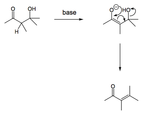 Compared to E1 and E2 this mechanism is less important, but it has its moments. The idea is that H+ leaves first to give a carbanion, which then loses X-. Obviously this mechanism can happen when stabilised carbanions can form. There is one set of compounds where this happens a lot, and which is important in synthesis and biochemistry, namely b-hydroxy carbonyl compounds, which you've seen as the products of the aldol reaction.