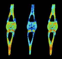 [[Image:Local erosion3.gif|thumbnail|upright=1.0|Local thickness variation in adult zebrafish vertebra. Vertebra was scanned using high resolution MicroCT and subject to a model-free algorithm for computing local thickness.]] | [[Image:Local erosion3.gif|thumbnail|upright=1.0|Local thickness variation in adult zebrafish vertebra. Vertebra on left was scanned using high resolution MicroCT and subject to a model-free algorithm for computing local thickness. The middle vertebra was subject to simulated resorption (via a one-pixel erosion); the right vertebra was subject to simulated bone formation (by subjecting the middle vertebra to a one-pixel pixel dilation.]] | ||