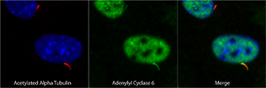 [[Image:AC6.png|thumbnail|upright=1.0|Adenylyl cyclase 6 localizes to the primary cilium in bone cells. While working in the lab of [http://openwetware.org/wiki/Jacobs Christopher Jacobs] at Stanford University, my co-authors and I found that the primary cilium, a solitary antenna-like structure once thought to be a vestigial organelle, mediates mechanosensing in bone cells via a pathway involving adenylyl cyclase 6.]] | [[Image:AC6.png|thumbnail|upright=1.0|Adenylyl cyclase 6 localizes to the primary cilium in bone cells. While working in the lab of [http://openwetware.org/wiki/Jacobs Christopher Jacobs] at Stanford University, my co-authors and I found that the primary cilium, a solitary antenna-like structure once thought to be a vestigial organelle, mediates mechanosensing in bone cells via a pathway involving adenylyl cyclase 6.]] | ||