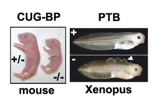 Figure 2 : Inactivation fonctionnelle de deux protéines de liaison aux ARN : CUG-BP1 et PTB. A. Les souris inactivées pour CUG-BP1 présentent un retard de croissance, une forte mortalité périnatale et sont stériles. B. Des embryons de xénope dont la PTB a été inactivée présentent des défauts de morphogenèse de la peau dorsale avec un développement de vésicules.