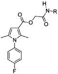 SMILES: Fc1ccc(cc1)n2c(cc(c2C)C(=O)OCC(=O)NC=4C(=O)N(c3ccccc3)N(C=4C)C)C