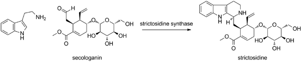 All monoterpene indole alkaloids are thought to be made via this route, the key intermediate of which is strictosidine, formed from a PS reaction between tryptamine and secologanin.