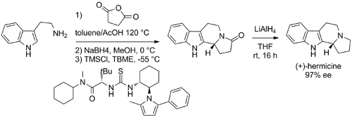 As a direct demonstration of the applicability of this new methodology, Jacobsen applied the enantioselective hydroxylactam cyclization to the total synthesis of (+)-harmicine with the cyclization proceeding in 97% ee followed by subsequent LiAlH4 reduction affording the natural product in only four steps from tryptamine. (Note - picture reads "Hermicine" - MAT)