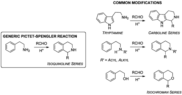 The Pictet-Spengler (PS) reaction is just over a century old.Pictet, Spengler 1911 The reaction is a cyclization between an amine that carries an aromatic ring, and an aldehyde, usually catalyzed by acid (Scheme 1911 Pictet Spengler 2). The original reaction employed formaldehyde and phenethylamine, to give the tetrahydroisoquinoline scaffold. Several years after the original report tryptamine was found to be perform well in the reaction permitting access to a range of tetrahydrocarbolines.[Tatsui 1928] A wide range of variations on these original themes have been investigated.Stöckigt 2011, Whaley, Govindachari[Youn 2006][Larghi 2011] such as cases where the amine component is acylated or alkylated, those where ketones are employed rather than aldehydes so as to generate quaternary centres adjacent to the aromatic ring, and reactions employing alcohols rather than amines - the so-called oxo-PS reaction.