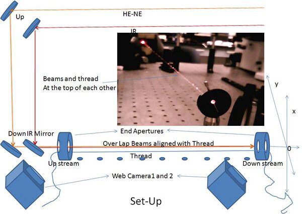 The goal of the set-up is to straighten and align the beams in x (horizontal to the set-up plain) and y (direction normal to the plain) directions, overlapping each other. According to the set-up I used two apertures, a sewing thread and two web cams. First aperture and web cam is installed next to the upstream IR-mirror with an opening size of the beam, next aperture and web cam is downstream roughly 70cms away. The thread is running right through the two apertures. Both the apertures are mounted on the vertical-expendable posts.