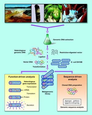 [[Image:CH391L_S13_Construction_&_Screening_of_Metagenomic_Library.jpg | thumb | right | | [[Image:CH391L_S13_Construction_&_Screening_of_Metagenomic_Library.jpg | thumb | right | 300 px | Schematic for the acquisition and analysis of metagenomic information]] | ||