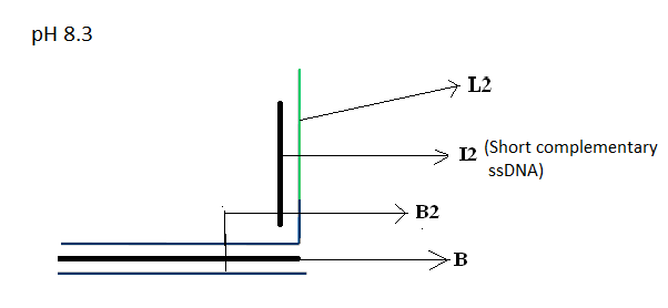 At Low pH (pH<5.5), L1 folds into an intra-molecular i-motif due to the formation of CHC+ (hemi-protonated Cytosine base pairs). This folding doesn't release the Input (I1) into the solution, but assists toehold mediated strand-displacement to module 2. | |||