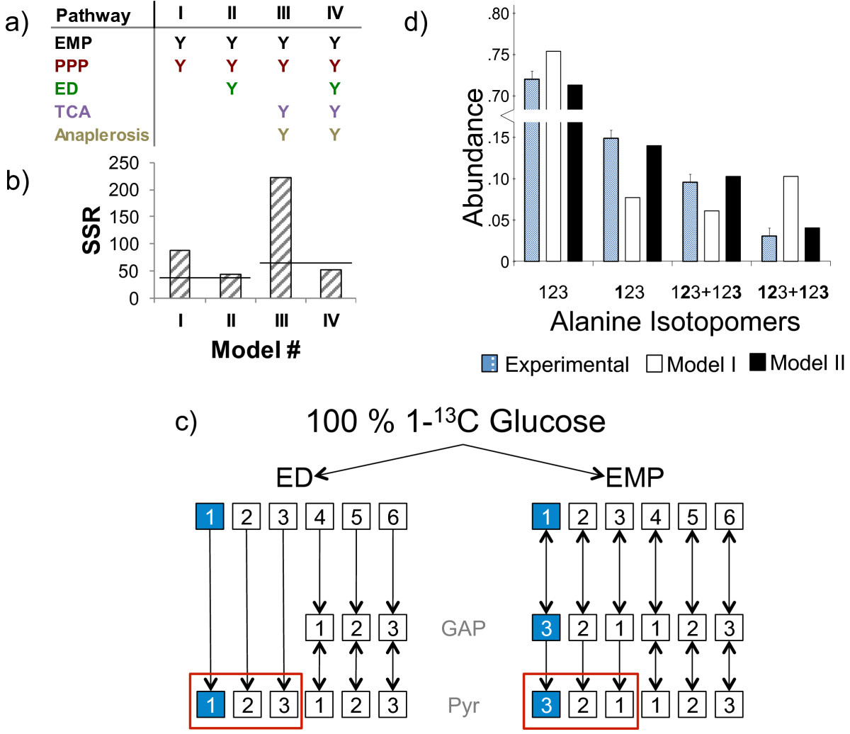Isotope-assisted metabolic pathway analysis in the marine diatom Phaeodactylum tricornutum reveals evidence for flux through the Entner-Doudoroff (ED) pathway . (a) Four different Metabolic Models (I-IV) were constructed to explain isotope labeling data from a 1-13C labeling experiment; each column represents a different model. Pathways included in a model are denoted by a “Y”, color-coded according to the color of the pathway in Figure 3. (b) Vertical bars represent the sum of squared residuals (SSR) of each model and horizontal lines represent the acceptable SSR corresponding to the number of redundant isotopomer measurements in each model. Models II and IV, both containing the ED pathway show a significantly decreased SSR compared to otherwise identical models lacking the ED pathway. (c) The carbon rearrangements of the Embden-Meyerhof-Parnas (EMP) and ED pathways are shown, with 13C atoms shown as blue squares and 12C atoms shown as white squares. The EMP pathway transfers 13C from glucose C-1 to pyruvate C-3, whereas the ED pathway transfers 13C from glucose C-1 to pyruvate C-1 (red boxes). (d) The isotopomers of the amino acid alanine reflect those of pyruvate. The measured abundances of alanine isotopomers are compared against the simulated enrichments of Models I and II. Model I that lacks the ED pathway over-simulates the abundance Ala{123, and under-simulates the abundance of Ala{123}}. These errors are corrected in Model II, which utilizes the ED pathway. Isotopomer notation: bold=13C, regular font=12C. See our publication for further pathway analysis and more detail.