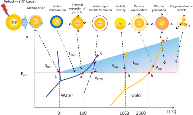 Fig. 1 Schematics of thermophysical responses of thermo-plasmonic heating shown in a phase diagram. Figure is from Qin et al. CSR 2012