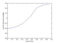 ResultsThe model for the growth curve was fitted to the experimental results as shown below. The experimental results is depicted by the red curve, while our model is shown by the green curve. The resource curve was also plotted as a function of time and is shown below. From experimental results, a log graph was plotted to determine the growth rate. The growth rate was then determined from the gradient of the log graph. This value was included when simulating the growth model using MATLAB. The following constants used to generate the model were found to yield the best fit to experimental results. GROWTH CONSTANT: A = 1.3494 INITIAL NUTRIENT CONCENTRATION: R_0 = 2 HILL COEFFICIENT: n = 1.25 INITIAL OD = 0.4 CONSTANT: [math]\displaystyle{ \alpha }[/math] = 0.64516