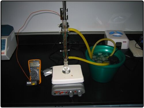 You can see the temperature I have the solution at. The PEM + casein is in the flask with a stir bar in it. Connected to the flask is a manifold (the tall thin glass thingy) that keeps the contents of the flask open to the atmosphere. Hence the reason I'm able to make temperature readings. I then pump cold water through the manifold using a fish tank pump. What happens is that the solution in the flask may evaporate but, when it comes in contact with the cold manifold, it condenses back into solution. I've used this setup before quite successfully for ion exchanges in Sephadex columns that require boiling the solution for over 6 hours at a time.