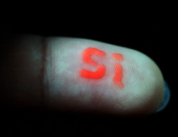 The element symbol for silicon spelled out on a fingertip with bio-friendly luminescent silicon nanoparticles.