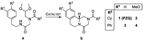 Besides the substrate (1a) required for the synthesis of PZQ by a PS approach, three other peptide acetal starting materials are worthy of investigation: the benzoyl analog (3a) and the dimethoxy-functionalised analogs of both these structures (2a and 4a). The change from cyclohexanoyl to benzoyl might influence the ease of initial acetal cyclisation to generate an acyliminium ion, and the final product of the reaction, the benzoyl analog of PZQ (3b), may be easier to crystallise/purify. Interestingly this benzoyl analog is more potent as an anthelmintic than PZQ itself, yet is not used as the drug of treatment; regardless, it is possible to convert the benzoyl PZQ analog fairly easily to PZQ. The two methoxy analogs are clearly of interest as they are more likely to participate in PS cyclizations. In fact the 6,7-di(MeO) analog of PZQ (2b) is itself biologically active, so again, the effective production of this molecule is an attractive possible alternative to enantiopure PZQ if the synthesis of (R)-PZQ proves intractable.