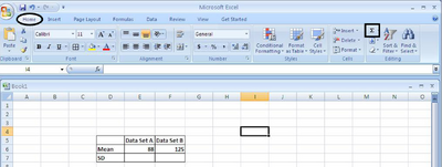 2) Calculate the mean of each group (Data Set A and B) using the AutoSum function located under the “Home” tab on the right-hand side.