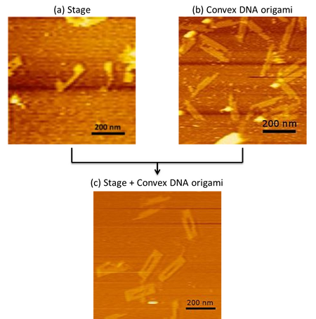 It was confirmed that Stage and Convex DNA origami were constructed. Next, we tried to combine them. The result is shown in Fig. 6 (c) and confirmed that Stage was combined with Convex DNA origami which width was observed ~17 nm. The yield was ~10% and a reason of the low yield is that the mixture was only incubated at room temperature without slowly annealing.