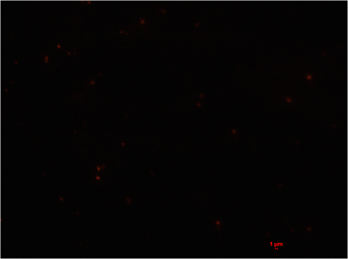 Fig 5. Fluorescence micrograph of fusion protein MreB combined with SWNT. Red fluorescence can be observed, indicating the activity of fusion protein were reserved.