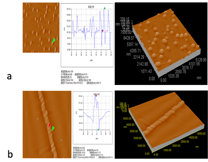 Fig 2.AFM analysis of MreB-RFP cell-free aggregation with SWNTs, indicating that SWNTs serve as scaffolds in the spiral winding of fusion proteins in vitro. a). AFM image of fusion protein MreB-RFP without SWNT scaffold, protein aggregated in disorder and only discrete spherical particles were formed. b). AFM image of fusion protein MreB-RFP at the presence of SWNT, protein aggregated and wound spirally onto the surface of nanotube.
