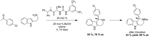Jacobsen published further work continuing with his cocatalyzed thiourea/benzoic acid Iso-Pictet-Spengler reactions in 2011. Here he focused on the synthesis of optically pure tetrahydro-γ-carbolines. He reports a straightforward procedure for upgrading the ee of the tetrahydro-γ-carbolines products by Boc protecting the free amine. This simple step elevates the ee to greater than 99% in nearly all the examples shown and by simple crystallization or trituration. Furthermore, the use of ketone substrates was also demonstrated and shown to proceed to similar yields and ee’s