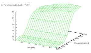 Figure - Average time evolution of the transfer curve of F2620 on pSB3k3 in MG1655. The surface shown is the mean of 6 clones. With +10min offset axis