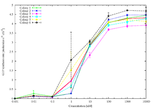 time evolution of the transfer curve of F2620 on pSB3k3 in MG1655 for six different colonies - not recalibrated nor updated yetAverage time evolution of the transfer curve of F2620 on pSB3k3 in MG1655. The surface shown is the mean of 6 clones.Individual transfer curves of the 6 clones at a single time point. Low/High Error barsIndividual transfer curves of the 6 clones at a single time point. Standard Deviation Error bars