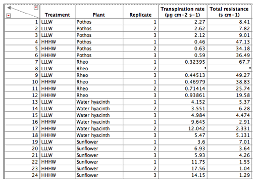 Input the data as illustrated below. Treatment, Plant and Replicate columns have the data type 'character' 'nominal' and Transpiration rate and Total Resistance are 'numeric' 'continuous'