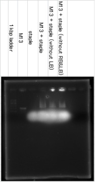 The band of M13+staple ran longer than the band of M13, it showed that the structure which had big molecular mass was created. The lower fuzzy band was the band of excess staple DNA. RB and LB means Right Bridge and Left Bridge. These connect three squares of DNA origami.
