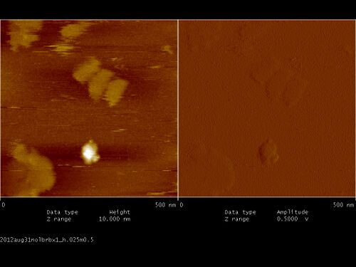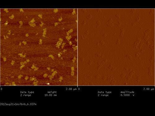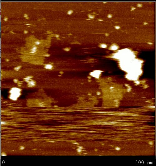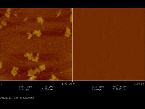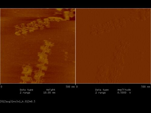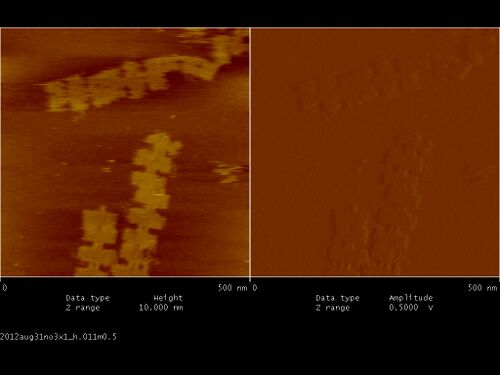 This picture was captured by AFM. In the picture, some square-like structures could be seen. They are exactly DNA Shell. And it is observed that almost central part of the Shell is white. This shows that central part is thicker than the other part of it.