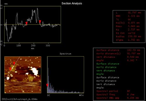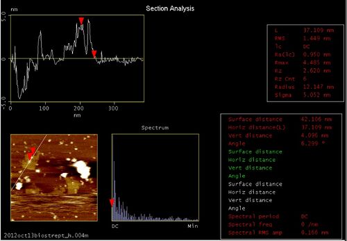 Shell is constructed from double helix, so it is reasonable to think that the value 2nm is Shell's thickness. The thickness at the white points in the Shell are equivalent to the thickness for approximately two folds of double helix. In addition, width of Shell at the design stage is approximately 120nm and the structure seen this time, width is almost 2/3. It is reasonable to suppose that this is because one outer sheet of the Shell is on top of the other sheet. That's why we estimated that Shell captured streptavidin. The white points of the Shell are small compared with the Shell itself because streptavidin is small (almost 60 Å)