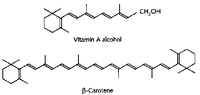 chemical structure of two carotenoids Plants can make their own carotenoids from scratch, but animals can't so we must eat all we need. Think of the bright orange color of carrots and you're thinking of the isoprenoid they make called beta-carotene. Cut beta-carotene in half and add a water molecule and you have Vitamin A ---which is why parents tell their kids to eat their vegetables. And why developing countries that have limited food supplies have high incidents of disease due to vitamin deficiencies. For example, between at least 250,000 children in the developing world go blind each year due to Vitamin A deficiency. It's a huge problem but not a new one. As we start this "Golden Bread" module, you may want to consider existing biotechnology approaches to this issue, including the story of "golden rice" and the social impact of GMOs in the US and in Europe.