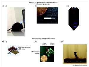 The basis of optogenetics is to use light to elicit a physiological response within the cell. This entails the uses of technologies that can illuminate transformed regions. In brief, these technologies include, LED, one-photon laser, optical fibers, and optrodes. [4]
