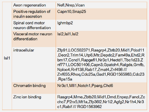 Further prove that candidate genes were presented in the network of significant gene area in rats. Three candidate genes (Cd11b, Isl1 and p75) were found in the networks of significant 20 or 50 edges. Gene Cd11b was presented in the networks of process integrin-mediated signaling pathway and leukocyte cell-cell adhesion. Gene Isl1 was presented in that of axon regeneration and retinal ganglion cell axon guidance. Gene p75 only presented in the network with inflammatory response of significant 50 edges. And gene EAAT3 presented in the network with transport, but beyond of significant 1000 edges. Other biological process either attached with too few probe id or did not presented of significant 2000 edges. Figure 3 showed where Isl1 was located and the correlation with other genes. Nevertheless, no correlation between Isl1 and other genes were connected with same edge in both networks, though some genes were returned.