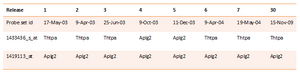 NetAffx probe-to-gene annotations can be changed as the sequence data are updated with approximately 5% over a two year span (Perez-Iratxeta & Andrade 2005). Affymetrix probe sets are annotated based on the related current records in UniGene, which is a database of clusters of GenBank sequences. The inconsistence between versions of NetAffx annotation files can be detected when two probe sets attached to the same gene in one version of the annotations, while they attached to different gene names in another version. Take probe ID 1433436_s_at and 1419113_at of eight versions of NetAffx MOE430A/B annotation files for example (Table 2). NetAffx has been released 30 versions of MOE430A/B since 17th May 2003.