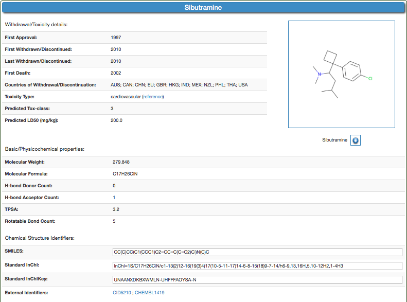 - Yes, I searched the withdrawal drug, Sibutramine, and information on when it was approved, discontinued, toxicity type, structure, molecular formula, weight and other information are provided. There are then links to show the drug-target interactions and drug-target PDB complexes.