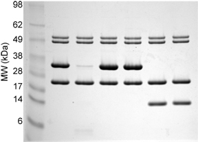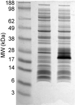 Sample bis-Tris MES-Tris Gels The first gel is of purified proteins. The second gel is of total E. coli lysate with and without an induced protein. Note the broad separation range of the molecular weight markers.