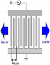 In lab, SAWs can be generated by Inter-digital Transducers (IDT) on piezoelectric crystal substrates as seen in Figure 2. The frequency of the generated SAW [math]\displaystyle{ f = c_{SAW}/2d }[/math]. [Equation 1] Here [math]\displaystyle{ c_{SAW} }[/math] is substrate acoustic velocity and [math]\displaystyle{ d }[/math] is electrode distancing4.