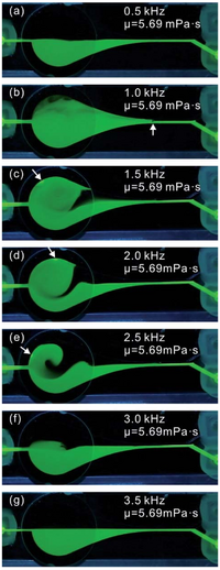 In some cases with microfluidics, near instantaneous mixing of a solution must be achieved. This is a difficult task to achieve in cross sectional channels where fluid flow is laminar and mixing only occurs over a diffusive boundary. SAW application can mix laminar channels, but the degree of mixing is slow and measured across a length of the channel. Here a stationary bubble can be used to achieve near instantaneous mixing of laminar flows across the cross sectional area of the channel as shown in Figure 4.
