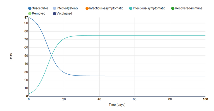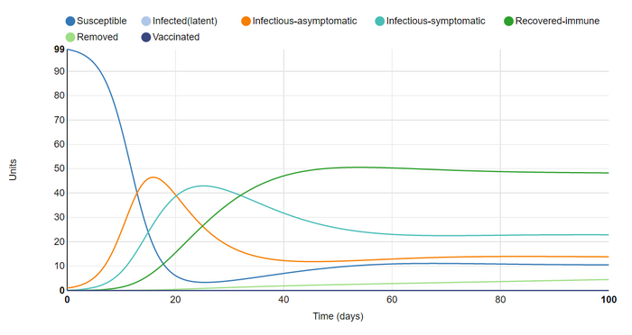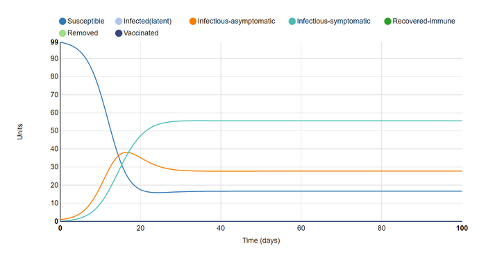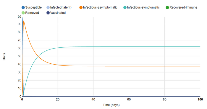 I then removed the vaccinations & tried to think about how I could infect as many units at once as possible. My first thought was to increase the number of effective contacts per unit (from 0.4 to 10). This definitely achieved my goal, with near 100% infection on day 1 (93 asymptomatic and 6 symptomatic). Interestingly, I found that the model did not assign a category to the 100th unit. I assume this is because there was some percentage of a unit in varying categories and the model is prevented from rounding any of these up. By infecting all units immediatly, I could clearly see as they moved between the stages of asymptomatic, symptomatic, and recovered. Also, I noticed that the model still reaches an equilibrium despite the fact that there are no susceptible units after day 1. Instead units are moved immediately from immune to infected.