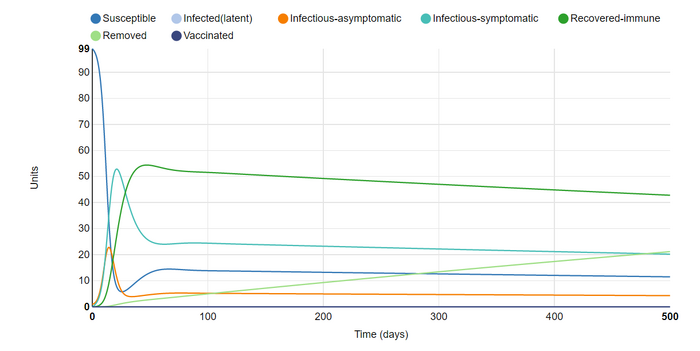 In this graph I set recovered units to remain immune for 30 days. This prevented the outbreak from resolving but did cause it to reach a sort of equilibrium as it did in the initial and first graphs. The steadily rising removed group led me to my next adjustment