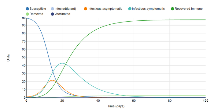 Next I added recovered-immune as an infection state. I set the removal (death) rate for infected units to 2.55%, so as to mirror the Covid-19 death rate in my home state of Arizona as of 9/14/2020 (AZDHS 2020). For this reason I also set the length of the asymptomatic infectious period to 3 days, and the symptomatic infectious period to 14 days (Harvard 2020). This changed the graph by adding a line for recovered-immune & removed from simulation (deceased). The fact that all recovered units were set to remain immune until removed from the simulation caused the outbreak to quickly resolve, which 95/100 units recovered-immune by day 60.