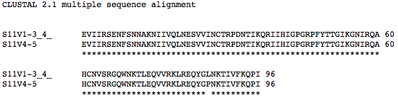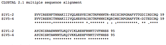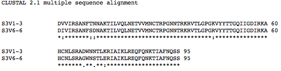 - A multiple sequence alignment was ran using the V3 Loop amino acid sequence for structures 1NAK, 1F58, and 2F58 (Shown Below). There is a slight region that is conserved within the sequence! Although this might be hard to determine between the subjects V3 amino acid sequenes becasue they are much longer than the ones below. We will see how it turns out in the following multiple sequence alignment.