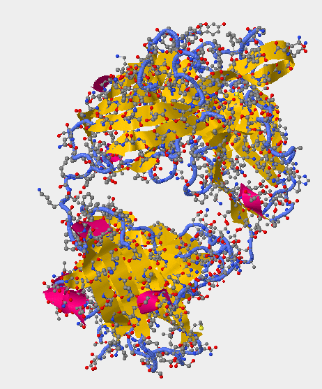 - Locate all the secondary structure elements (found below. purple=helices; yellow=sheets; blue=coils. Do these match the predictions you made above? Yes for all of the helices --> they match. As for the sheets and coils, some of them match while others do not.