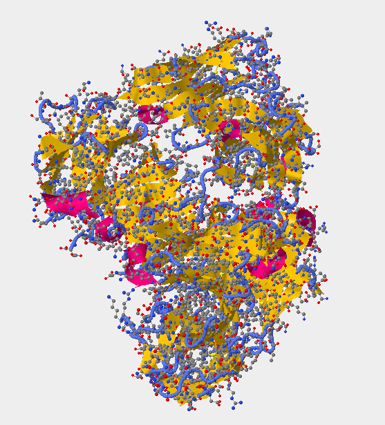 - V3 region for secondary structure 1GC1 is not present --> has the whole gp120 excluding V3 region. Region 300G-328G is missing! In between the coil (blue) and sheet (yellow) in the following picture is where the V3 region should be.