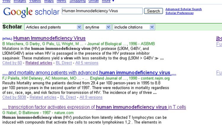 - The results for a Google Scholar search "Human Immunodeficiency Virus" seem to be more relevant than the results in Pubmed. The third result explains the expression of HIV in T Cells. The format of Google Scholar, however is worse than PubMed. The search results don't seem categorized and aren't as easy to distinguish.