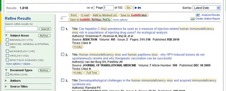 - The ISI Web of Knowledge Database is much more organized and makes much more sense to the user. I love the bar on the side to limit results. This provides a lot of options to limit or expand results. A simple "Human Immunodeficiency Virus" search under "Topic" can be limited to Review articles.
