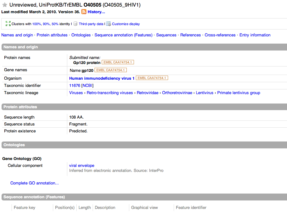 - Accession #O40505: Here is a screenshot of the information provided for this human gp120 protein