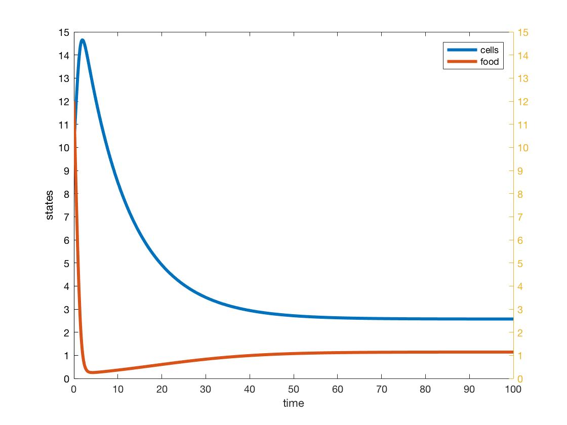 Use the MATLAB files chemostat_script.m and chemostat_dynamics.m to simulate a chemostat and compare the computations to a steady state outcome. You will find those codes in the zipfile here