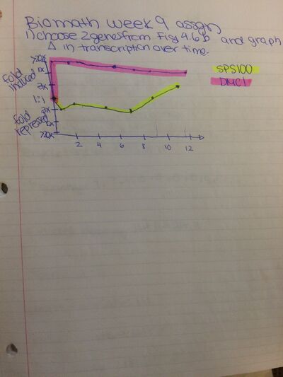 - (Question 5, p. 110) Choose two genes from Figure 4.6b (PDF of figures on MyLMUConnect) and draw a graph to represent the change in transcription over time. You can either create your plot in Excel and put the image up on your wiki page or you can do it in hard copy and turn it in in class.