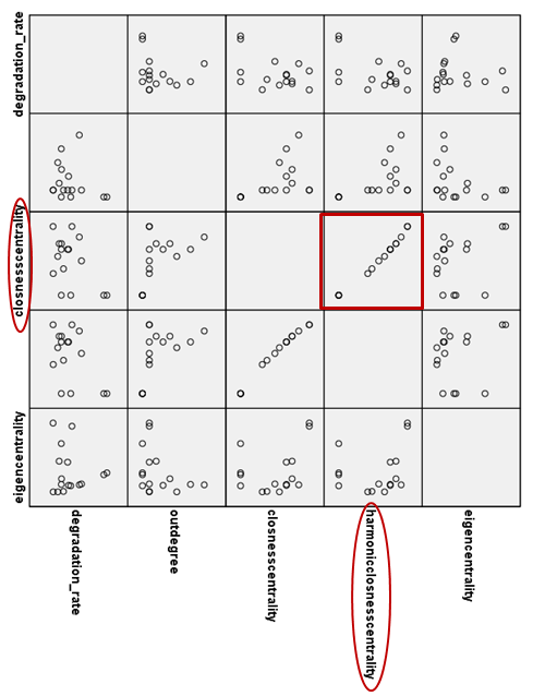 - To visualize how a colinear variable in your model is related to the other independent variables, it is useful to generate a matrix of scatter plots. To do so, navigate to Graphs-> Legacy Dialogs-> Scatter/Dot... In the resulting menu, click on the "Matrix Scatter" option and then select "Define". This will open the Scatterplot Matrix window, where colinear variables can be imported as "Matrix Variables" for analysis. Once the variables in questions have been defined, click "Okay" to generate the matrix of scatter plots. Variable names will be listed on the x and y axes. Review the matrix for scatter plots that exhibit a linear pattern. The variables plotted in these scatter plots are said to be colinear, and one of them will have to be removed. A sample scatter plot matrix showing two highly colinear graph statistics, closeness centrality and harmonic closeness centrality (Colinearity Statistics: Tolerance >0.0003, VIF >3500), is shown below.