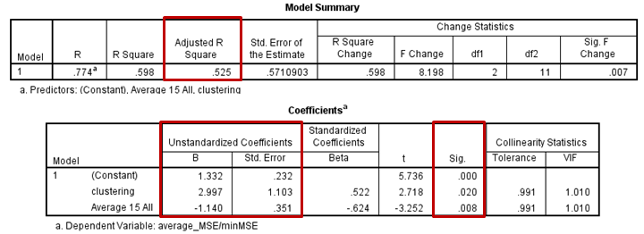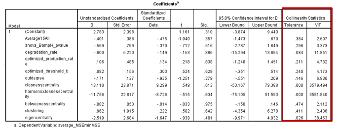 In the final model, all coefficients should be listed as significant. Record the Adjusted R Square value for the model. Multiplying this value by 100% will indicate the percent of the variance in the independent variable that is explained by the predictors in your final regression model. Further, record the coefficient B values, standard errors, and their associated significance. The B values indicate the degree to which each predictor is either positively or negatively correlated to the dependent variable in the final model. Assessing these relationships can yield information about how changes in each independent variable effect the dependent variable, which can be used to evaluate model performance and consider biological implications. A significant model for db2 in which average MSE:minMSE ratio is the dependent variable is provided below. One conclusion that could be drawn from this model is that GRNmap is best able to fit a node's expression when it is upregulated (optimized production is therefore high). Conversely, when degradation is the dominant part of a node's dynamics, it is harder for GRNmap to model that node's expression.